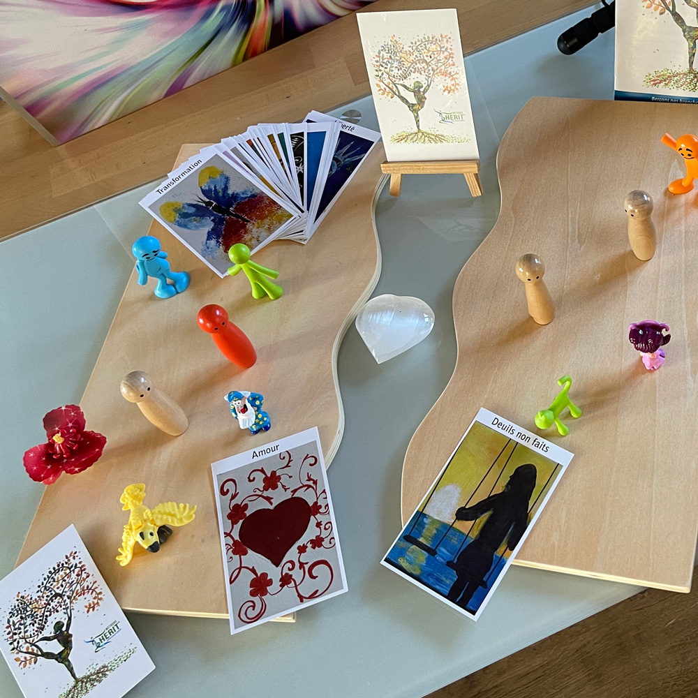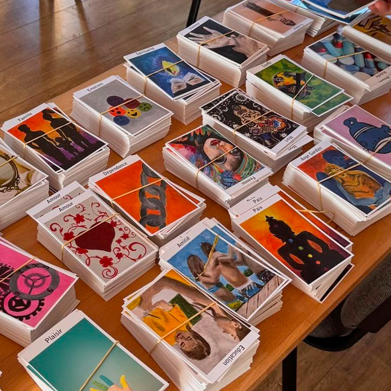 Étaler les cartes et demander de choisir 3 cartes qui sont des sujets présents dans sa famille ou ceux qu’il souhaite aborder.